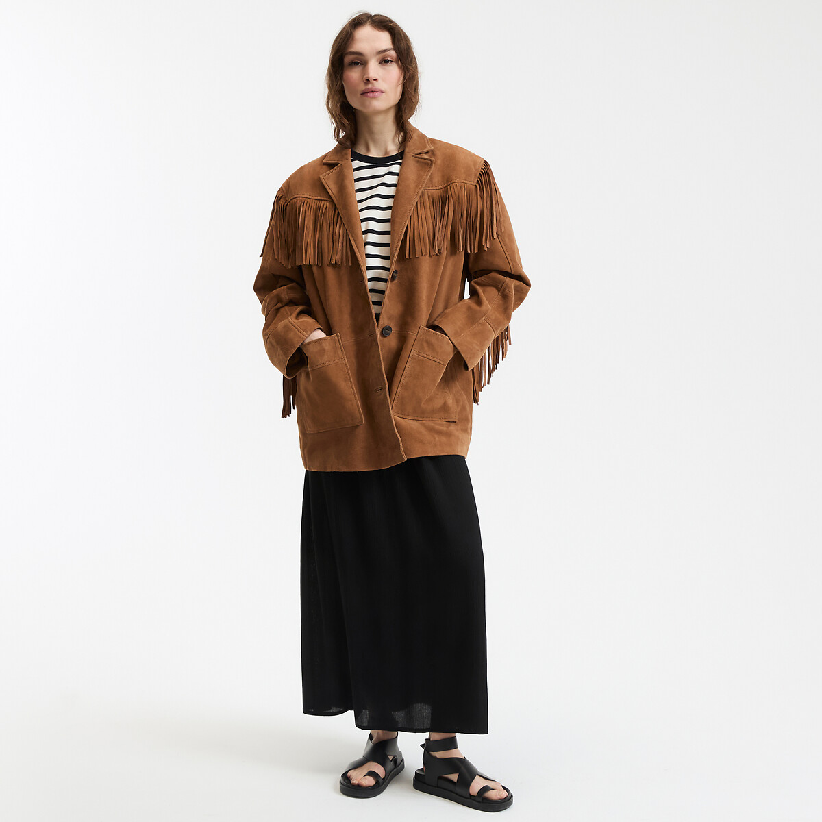 Yumuşak ve kaliteli gerçek süet kumaştan üretilen bu ceket, omuz ve kol boyunca uzanan zarif püskül detaylarıyla klasik western stilini modern bir tavırla yeniden yorumluyor. Oversize kalıbı ve özenli dikiş geçişleri, hem dikkat çekici hem de rahat bir kullanım sunuyor. İster basic parçalarla sade bir görünüm yakalayın, ister özgün kombinlerle stilinizi vurgulayın. Bu parça, gardırobunuzun yıldızı olmaya aday.